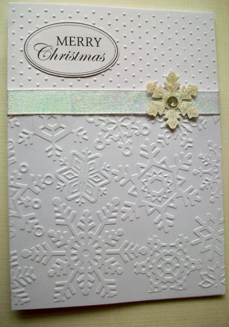 Two cuttlebug embossing folders, white pearlised card, some ribbon to hide the join (lol), a die cut snowflake suitably blinged with lashings of glitter and a freebie sentiment with a few sparkly gems and voila!!